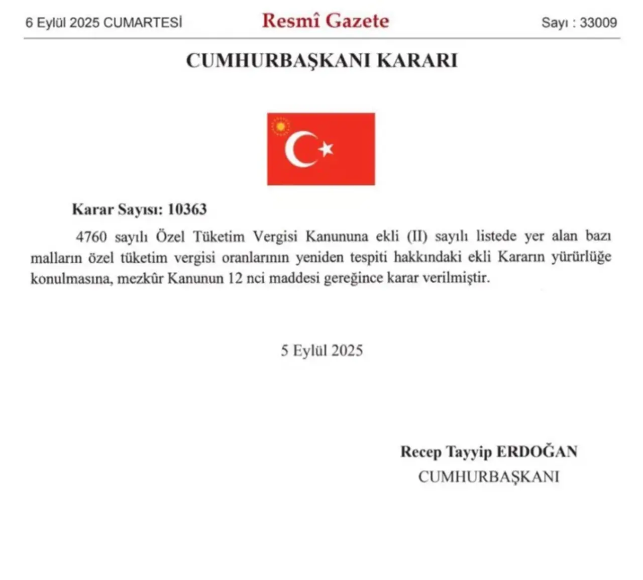 5 Eylül 2025 tarihli ve 10363 sayılı kararla, 4760 sayılı ÖTV Kanunu’na ekli (II) sayılı listede değişiklik yapıldı. Bu liste, motorlu taşıtlardan gemilere kadar birçok ürünü kapsıyor. Yapılan bu düzenlemeyle birlikte deniz araçlarında uygulanan ÖTV oranı sıfırdan yüzde sekize çıkarıldı.